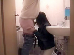 Like a worthy assistant she’s on her knees on the floor and engulfing her boss’s wang with excitement. In a minute that babe makes him cum and spits the cream in the sink.