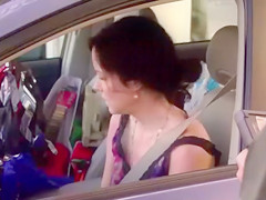 Cute brunette hair actress spends the scene in a car and there’s one outstanding downblouse discharged of her cleavage as this babe climbs into the front seat.