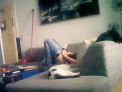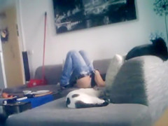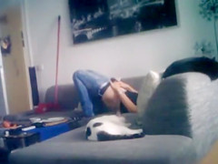 My sweetie rubs her clitoris on the ottoman at home