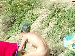Hotty with plug in the a-hole positions for a lad at a public beach