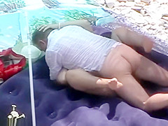 Hotty with plug in the a-hole positions for a lad at a public beach