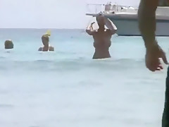 Une meuf apprécie de montrer ses gros seins moelleux à la mer