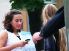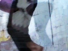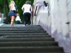 Drop dead pretty legal age teenager schoolgirl in a cute outfit and a petite dark petticoat tries to hide her ideal arse from the upskirt voyeur as that babe climbs the steps in the town