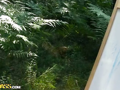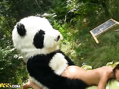On a sunny summer day a pretty artist decided to go to the woods to paint a beautiful landscape picture. But her plans were ruined when she saw a huge panda bear coming near her. However, he turned out to be so cute and playful, the teenage hottie forgot about her painting and even let him take her clothes off. And then she saw panda's strap on penis, and there was only dirty sex on her mind. The girl spread her legs wide, letting the horny bear drill her oozing pussy with that awesome megadildo of his.