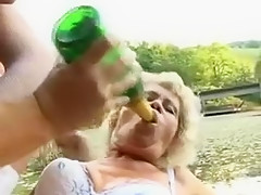 Grand-mere salope baisee dans la boue avec une bouteille