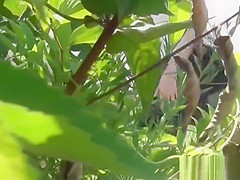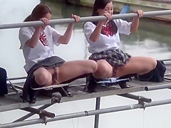 Outlandish oriental teenagers peeing outside