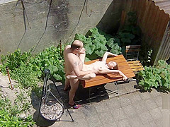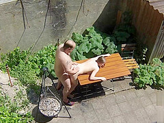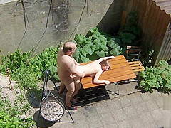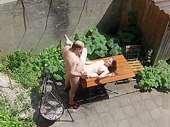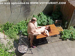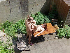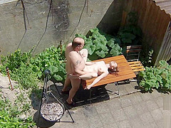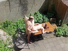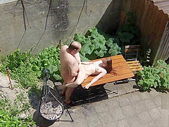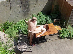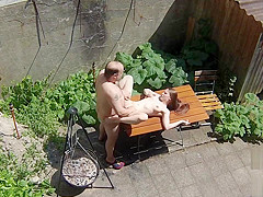 Voyeurs filming legal age teenager doxy fucking with old janitors on the terrace