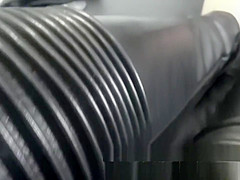 Femdom Dominatrix In Full Leather Outfit Puts On Lengthy Gloves