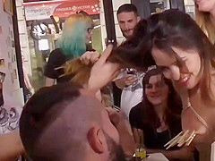 Euro playgirl takes facual cumshots in public bar
