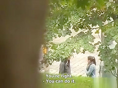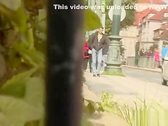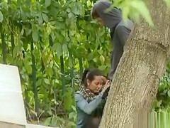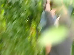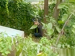 Outdoor voyeur movie scene of wicked man with hawt brunette hair in garden having good fuck