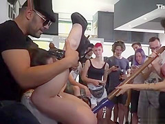Breasty brunette hair screwed in public with fake penis